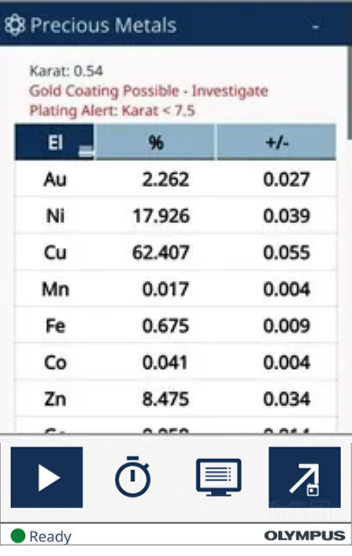 如圖所示,透過Vanta GX 貴金屬分析儀驗證金飾時,得知此金飾的純金含量只有2.262%的黃金(Au)含量,但鎳(Ni)含量為17.926%、銅(Cu)含量高達62.407%。故可得知此金飾為俗稱白銅的鎳銅合金,鍍金上一層薄薄的黃金,因為Vanta GX除了告知金屬含量為何外,若有遇到樣品疑似有鍍金(Coating)的狀況,也都會在窗口中一并告知(如圖上方的紅色警告字語)。