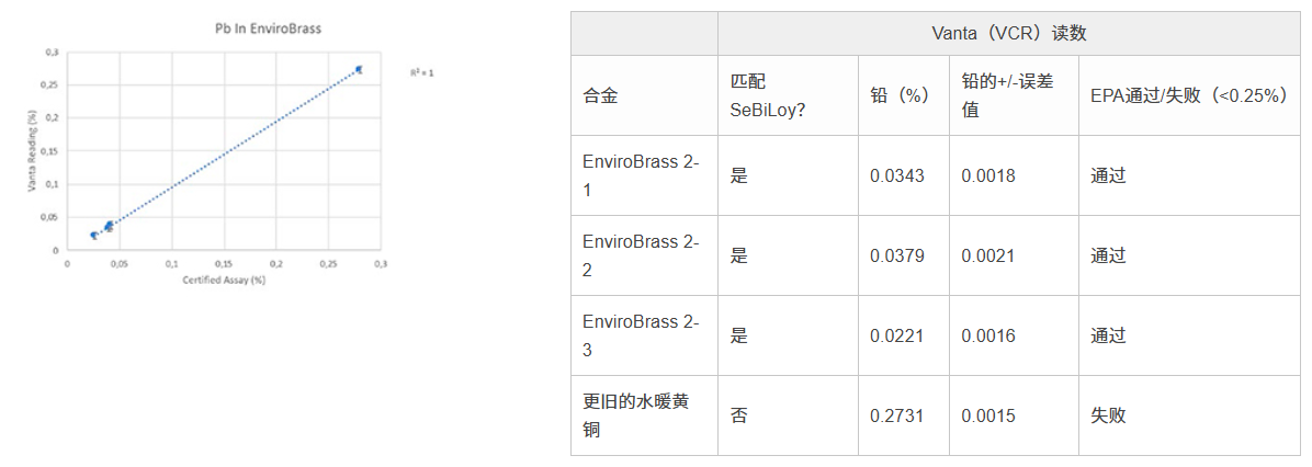 我們可以使用Vanta VCR型號分析儀,分析多種黃銅和銅合金認證參考材料(CRM),以辨別出不同的重金屬和受到監(jiān)管的元素。Vanta XRF分析儀具有探測各種不同環(huán)境黃銅中低水平鉛元素的優(yōu)質性能,可以確保所用水暖材料符合0.25%鉛含量的要求,如下圖所示。在所完成的鉛元素定量分析的過程中,10多次檢測的結果表明:鉛的含量都低于監(jiān)管的操作水平。此外,我們還分析了一個更舊的不符合規(guī)范的黃銅樣件,以進行對比分析。