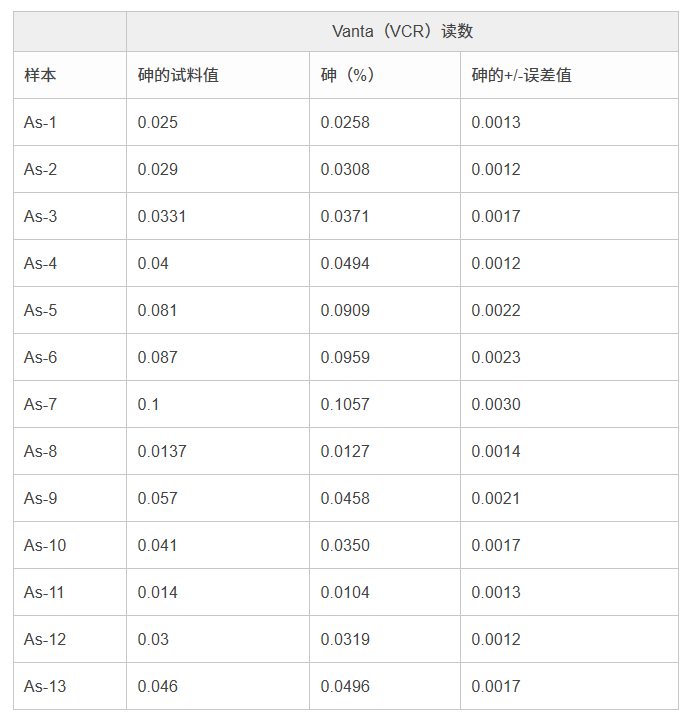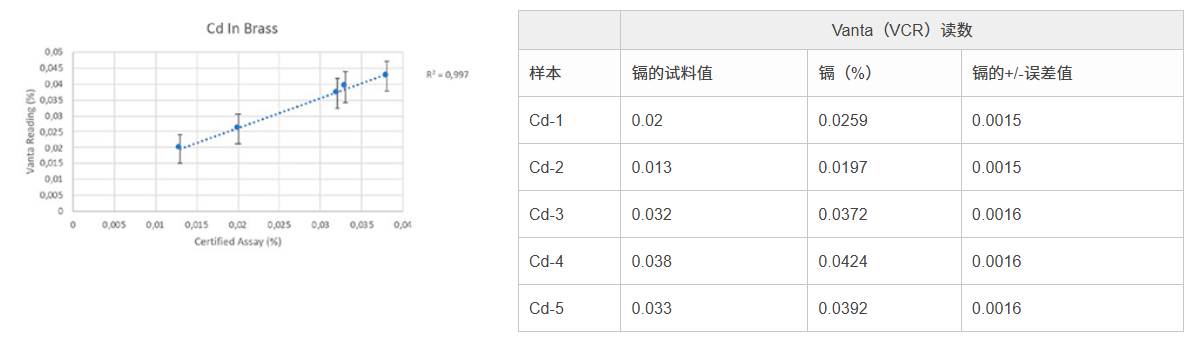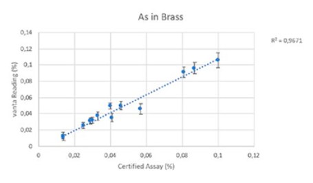 此外,Vanta分析儀還可以有效地測量會影響飲用水安全的多種其它元素,如:砷(As)和鎘(Cd)。下面顯示的是分析儀檢測多種黃銅認證參考材料時獲得的有關其它有毒元素的檢測結果。