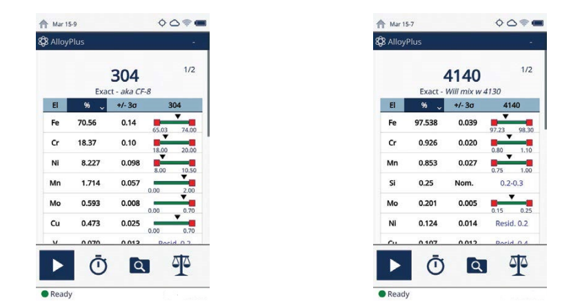 由于屏顯牌號(hào)對(duì)比信息的存在,用戶可以將合金牌號(hào)手冊(cè)留在辦公室中。得益于屏顯牌號(hào)對(duì)比信息功能,用戶可以對(duì)比Vanta分析儀屏幕上排列在一起的近似牌號(hào),以了解最佳匹配牌號(hào)以及如此判斷的原因。