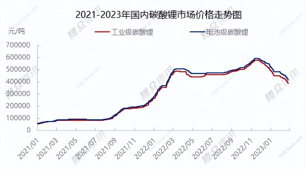 據(jù)上海鋼聯(lián)數(shù)據(jù)顯示,2月23日,電池級碳酸鋰跌7500元/噸,均價報41.5萬元/噸;工業(yè)級碳酸鋰跌10000元/噸,均價報38.5萬元/噸。其中,電池級碳酸鋰當(dāng)前報價相比2022年11月每噸60萬元的高點,跌幅超過30%。