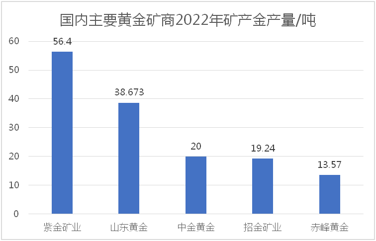 2022年,招金礦業礦產黃金19.24噸,中金黃金2022年前三季度礦產金產量為14.9噸,全年預計約19-20噸,赤峰黃金上一年度實際完成黃金產量13.57噸,首次突破10噸。招金和中金、赤峰黃金,形成了國內黃金產量的第二梯隊。