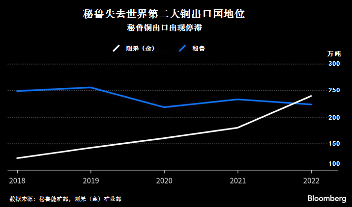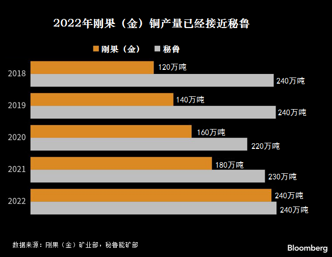 最近的一份報(bào)告認(rèn)為,未來幾年,由于秘魯產(chǎn)量停滯,剛果(金)將占據(jù)全球第二大產(chǎn)銅國的位置。鄰國智利仍然是世界最大銅生產(chǎn)國和供應(yīng)國。彭博通訊社報(bào)道,2022年剛果(金)銅出口量為240萬噸,而秘魯銅出口量為220萬噸。