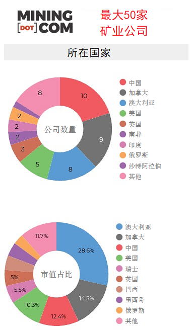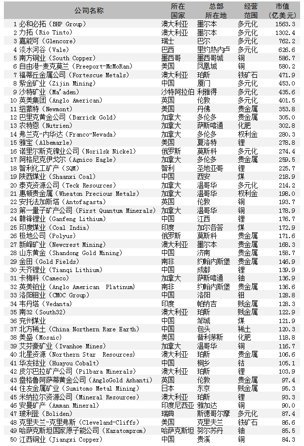 目前,50大礦企市值合計為1.38萬億美元,回落到2021年6月底的水平。