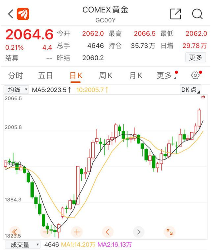 繼上周五國際金價突破2000美元關口后,11月29日紐約商品交易所COMEX12月黃金期貨持續(xù)收漲,截止29日八點,該指數(shù)暫報2064.7美元,連漲四日且創(chuàng)5月中旬以來的半年新高,也越來越逼近2080美元的歷史最高。