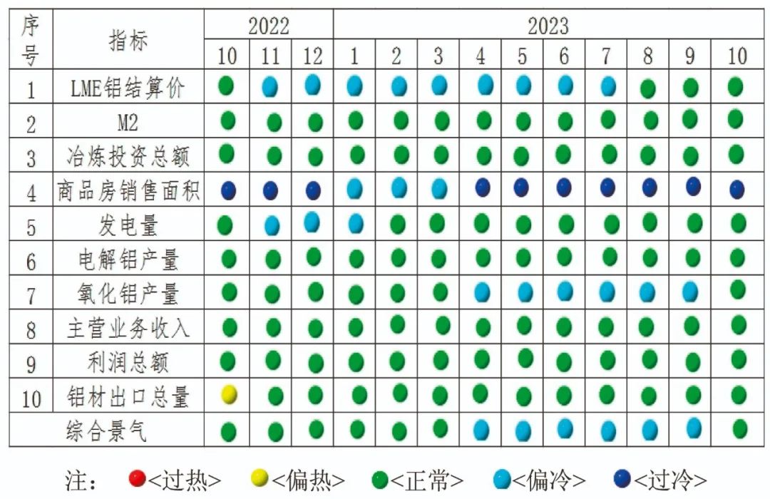 由中國鋁冶煉產(chǎn)業(yè)景氣信號燈(見圖2)可見,2023年10月份,在構(gòu)成產(chǎn)業(yè)景氣指數(shù)的10個指標中,LME鋁結(jié)算價、M2、發(fā)電量、電解鋁產(chǎn)量、鋁冶煉投資總額、氧化鋁產(chǎn)量、主營業(yè)務(wù)收入、鋁材出口總量和利潤總額等9項指標均處于“正常”區(qū)間;商品房銷售面積處于“過冷”區(qū)間。
