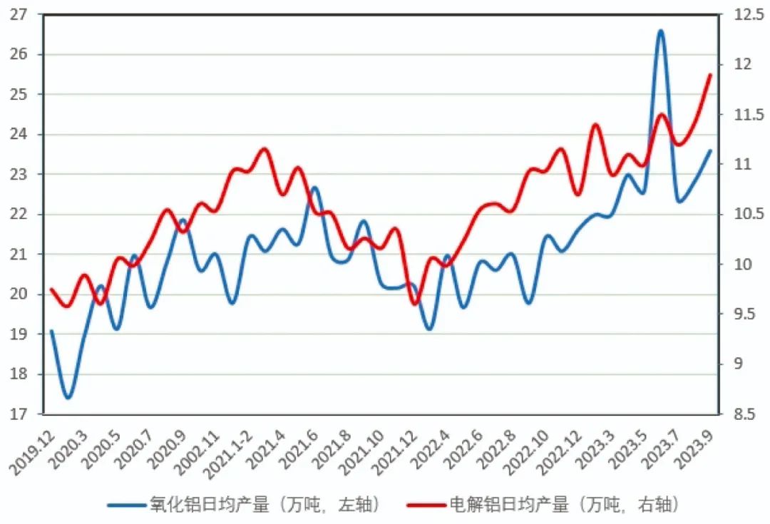 二是生產(chǎn)總體保持平穩(wěn)。9月份,全國電解鋁和氧化鋁的產(chǎn)能產(chǎn)量總體保持平穩(wěn)。部分地區(qū)電解鋁企業(yè)減產(chǎn),主要集中在云南地區(qū),云南地區(qū)枯水期將近,用電調(diào)節(jié)開始施行,部分電解鋁企業(yè)被要求提前采取電力負荷管控措施,實施降負荷運行,省內(nèi)計劃第一輪壓減相關(guān)電解鋁企業(yè)約20%產(chǎn)能,預(yù)計減產(chǎn)規(guī)模約為115萬噸。9月份,全國電解鋁產(chǎn)量為357.7萬噸,同比上升5.3%,日均產(chǎn)量11.9萬噸,環(huán)比上升0.3萬噸 ,同比上升0.6萬噸;氧化鋁產(chǎn)量為707.2萬噸,同比上升1.6%,日均產(chǎn)量23.6萬噸,環(huán)比上升0.8萬噸,同比上升0.1萬噸。鋁冶煉產(chǎn)品月度日均產(chǎn)量見圖5。