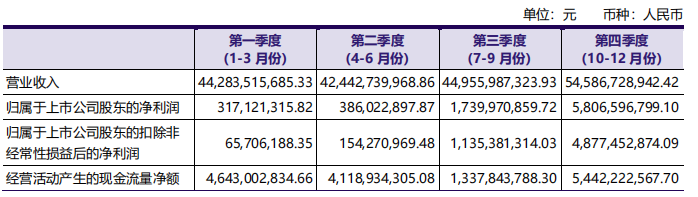 年報數據顯示,2023年,公司實現(xiàn)營業(yè)收入1862.69億元,同比增長7.68%;實現(xiàn)歸屬于母公司凈利潤82.50億元,同比增長36%,雙雙創(chuàng)下歷史新高。其中,第四季度實現(xiàn)盈利58.07億元,同比增長257.89%,創(chuàng)下有史以來單季度盈利新高。