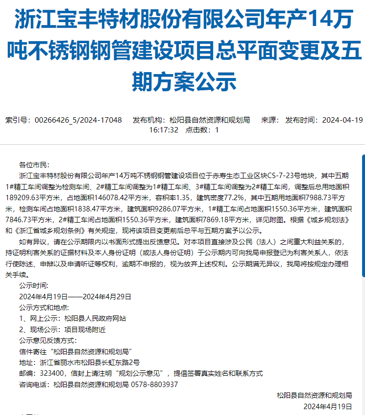 4月19日,麗水市松陽縣人民政府發布,松陽縣自然資源和規劃局就浙江寶豐特材股份有限公司年產14萬噸不銹鋼鋼管建設項目總平面變更及五期方案對外進行公示,公示時間:2024年4月19日-2024年4月29日。