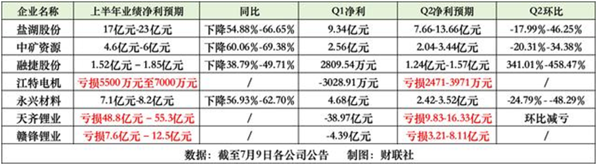 7月10日,另一鋰業“龍頭”贛鋒鋰業發布公告,預計上半年凈利虧損7.6億元–12.5億元,上年同期盈利58.5億元。
