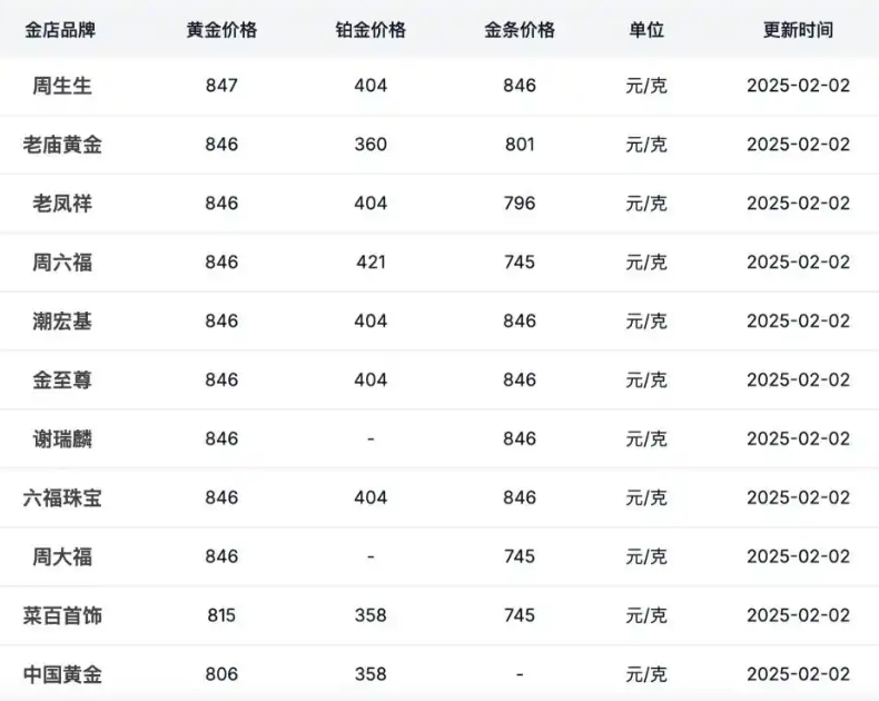 國(guó)內(nèi)零售端品牌足金飾品的價(jià)格同樣水漲船高。2月2日,國(guó)內(nèi)黃金珠寶品牌足金首飾價(jià)格最高已突破847元/克。