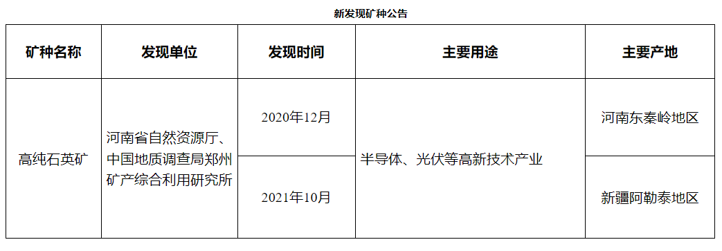 自然資源部表示,本次設立確定的新礦種叫高純石英礦,是指經選礦、提純可獲得二氧化硅的純度不低于99.995%,雜質、包裹體含量滿足半導體、光伏等高新領域應用要求的巖石。