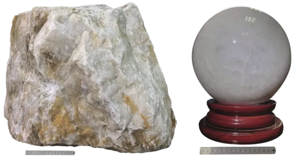 我國脈石英高純石英優(yōu)質(zhì)原料或A級礦(左)和安哥拉脈石英加工的石英球(右)。成都自然博物館(成都理工大學(xué)博物館)/ 藏