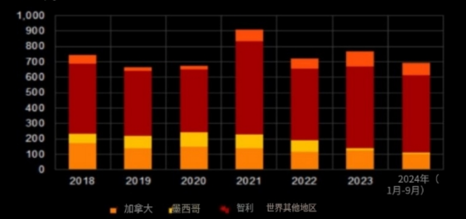 根據2025年USGS發布數據,2024年美國共有25個銅礦山,其中17個占總產量99%以上。由于礦石品位降低,銅礦產量比2023年下降3%,國內開采銅產量為110萬噸,位列全球第五。精煉銅產量為89萬噸,比2023年略有增長,位居全球第六。精煉銅進口81萬噸,主要來自智利65%、加拿大17%、墨西哥9%、秘魯6%、其他國家3%。回收銅約占美國銅供應的35%,美國是世界上最大的廢銅出口國,每年出口近百萬噸,大部分被運到中國進行加工。通過以上數據可以看出,一方面是美國國內銅礦資源開發緩慢,另一方面是國內冶煉加工能力短板凸顯。