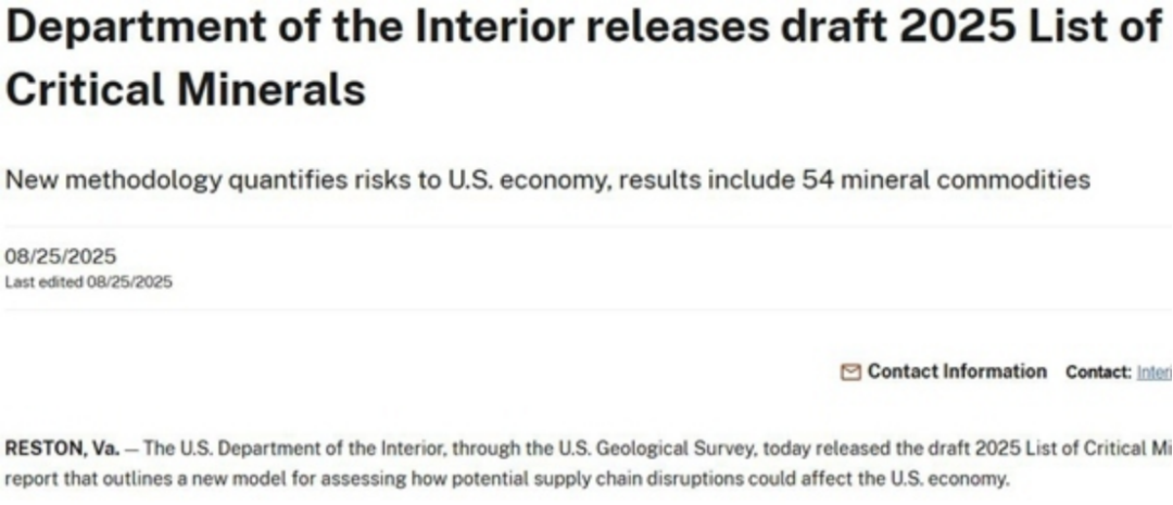 當(dāng)?shù)貢r間8月25日,美國地質(zhì)調(diào)查局發(fā)布《2025年關(guān)鍵礦產(chǎn)清單》草案,54種礦產(chǎn)被列入清單。根據(jù)美國《能源法案》,關(guān)鍵礦產(chǎn)是由美國地質(zhì)勘探局認(rèn)定的對美國經(jīng)濟(jì)和國家安全至關(guān)重要的礦產(chǎn)或物質(zhì),且相關(guān)礦產(chǎn)是產(chǎn)品制造的基礎(chǔ),但供應(yīng)鏈脆弱。被確定為關(guān)鍵礦產(chǎn)后,相關(guān)礦產(chǎn)的勘探開采和處理將享受資金激勵和更廣泛的支持性政策。