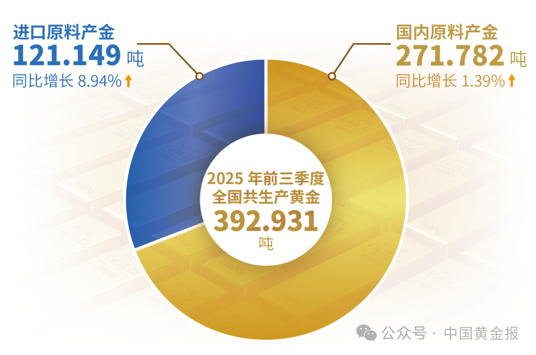 黃金生產 據中國黃金協(xié)會最新統(tǒng)計數據顯示:2025年前三季度,國內原料產金271.782噸,比2024年同期增加3.714噸,同比增長1.39%。另有進口原料產金121.149噸,同比增長8.94%。國內原料和進口原料共計生產黃金392.931噸,同比增長3.6%。