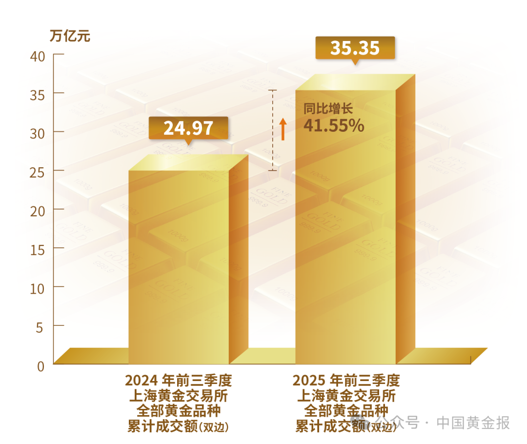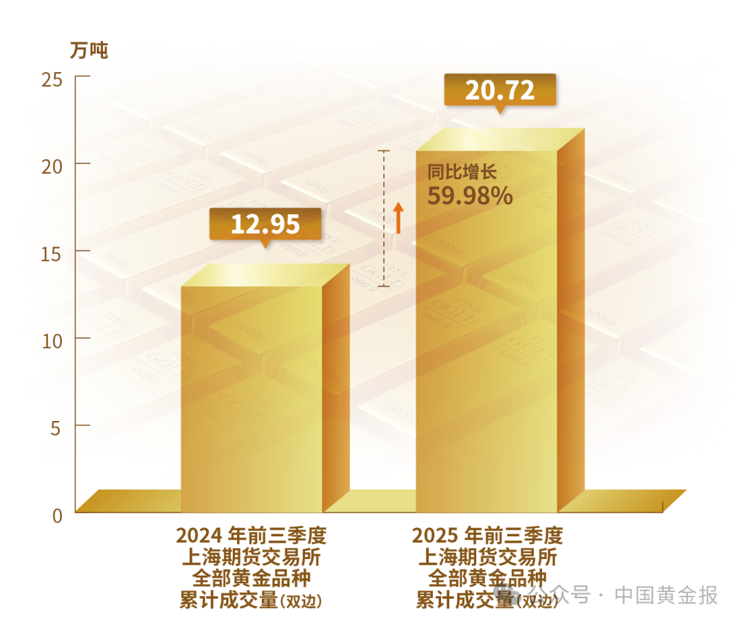 不同品類黃金產品的表現差異明顯。輕克重、附加值高的首飾產品仍保持較強市場吸引力,銷售情況較好。金條需求仍然旺盛,地緣沖突加劇與經濟不確定性使得黃金避險保值的功能進一步凸顯。電子、新能源等產業(yè)的快速發(fā)展使得工業(yè)用金需求穩(wěn)步回升。 黃金市場 2025年前三季度,上海黃金交易所全部黃金品種累計成交量單邊2.38萬噸(雙邊4.76萬噸),同比上升2.45%;累計成交額單邊17.68萬億元(雙邊35.35萬億元),同比上升41.55%。上海期貨交易所全部黃金期貨期權累計成交量單邊10.36萬噸(雙邊20.72萬噸),同比上升59.98%;累計成交額單邊61.08萬億元(雙邊122.15萬億元),同比上升112.6%。