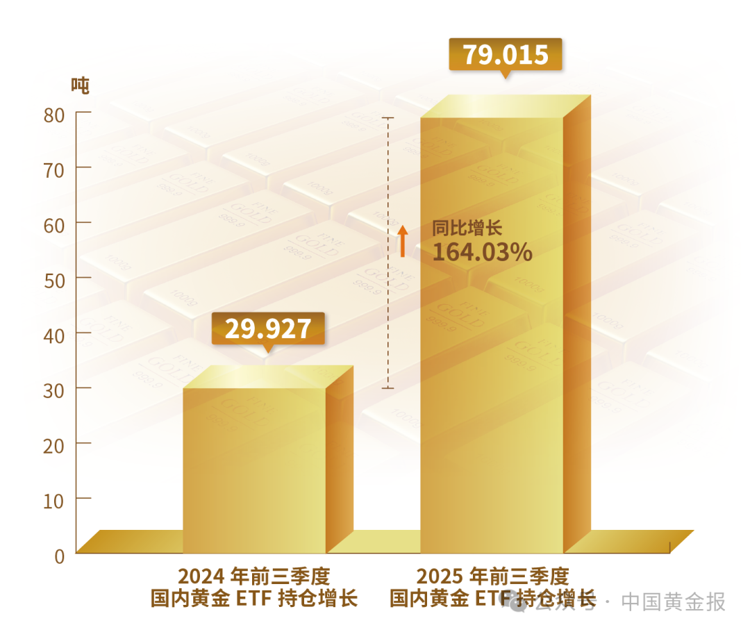 2025年前三季度,國內黃金ETF增倉量為79.015噸,較2024年前三季度增倉量29.927噸,同比增長164.03%。至9月底,國內黃金ETF持倉量為193.749噸。
