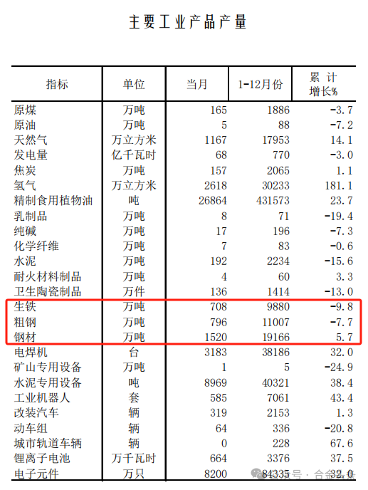 ○生產端呈現 “減量提質” 態勢:生鐵9880萬噸(-9.8%)、粗鋼11007萬噸(-7.7%)、鋼材19166萬噸(+5.7%)。