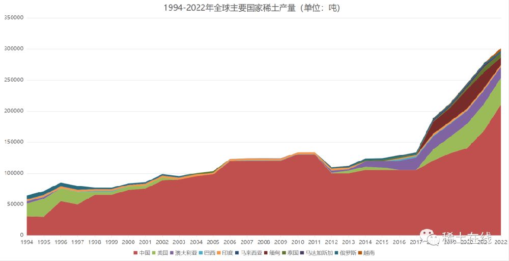 2022年全球稀土礦產量竟達到了30萬噸,而中國占比提升至70%